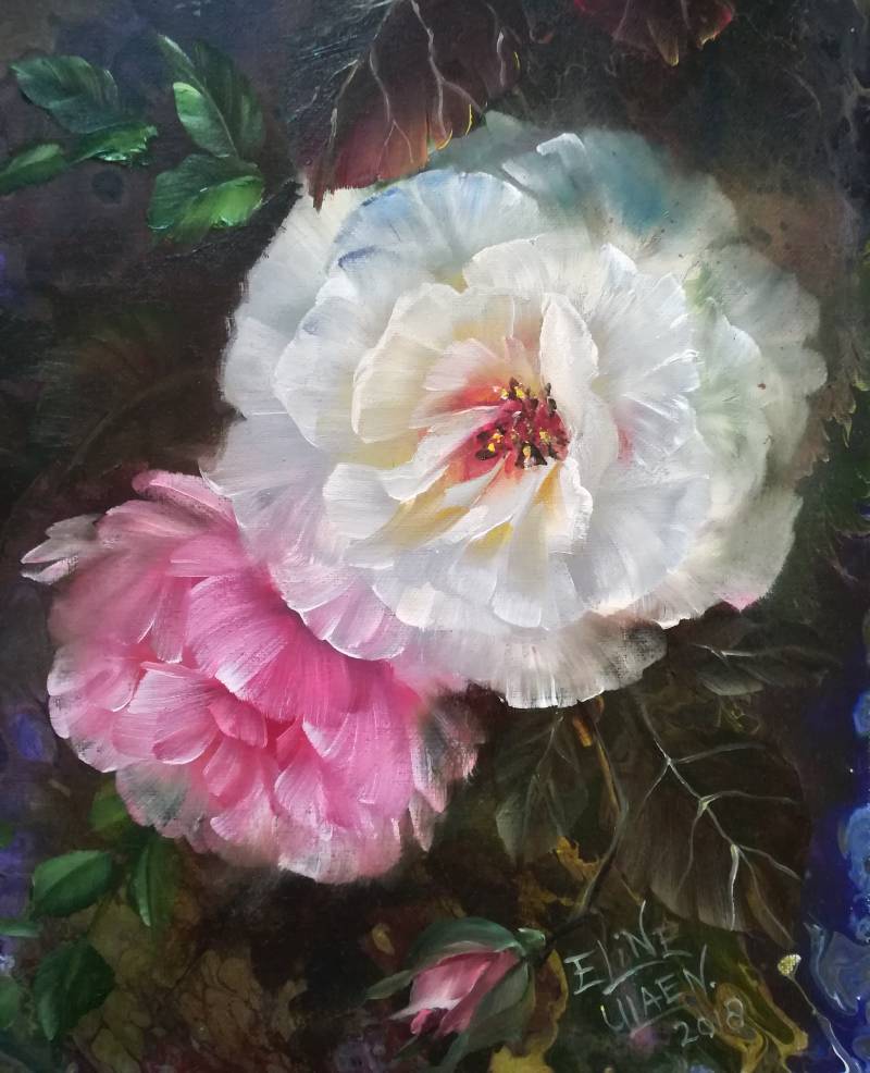 Eline is gespecialiseerd in de bloem-schilder technieken van Gary Jenkins.In Arizona leerde zij van hem hoe je op een vlotte, verfijnde manier rozen kunt schilderen. Zij mag dat nu ook aan u leren.