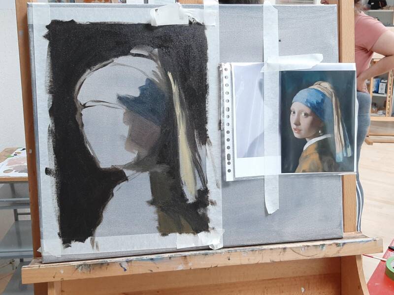 Het schilderij werd stap voor stap aan de hand van aanwijzingen van Eline opgebouwd. Het was voor sommige even zoeken naar de juiste techniek maar al snel zag je de vormen van het gezicht op het doek verschijnen. De koffie, thee en andere versnaperingen werden weer goed verzorgd door Hilbert.