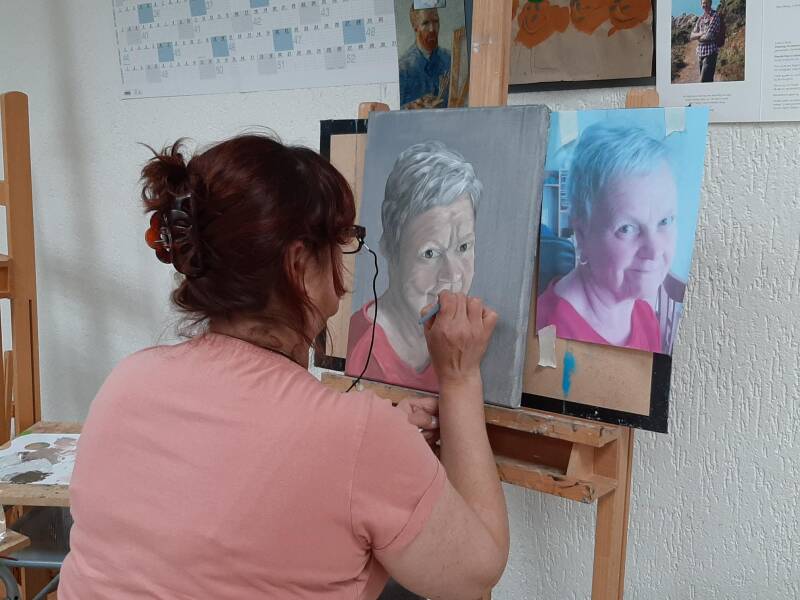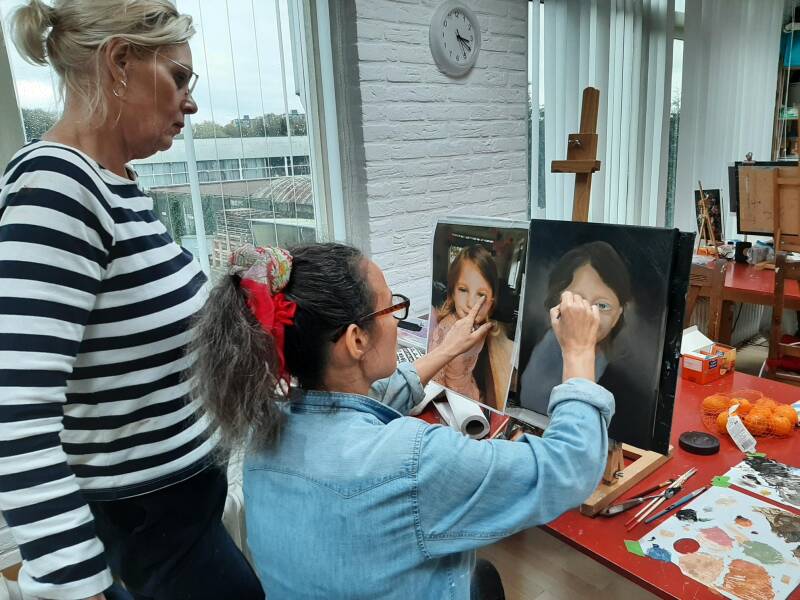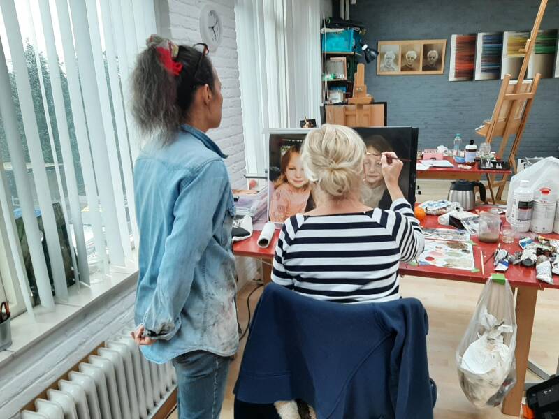 In de middag werd veel aandacht besteed aan de verdere opbouw van het schilderij en de details. De stap voor stap uitleg was voor iedereen weer een goede basis om een mooi portret te maken.