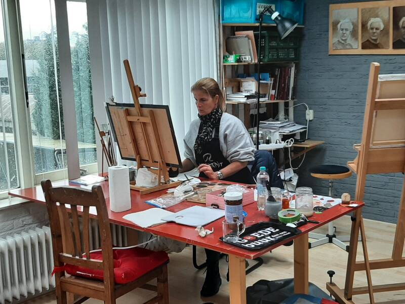 Voor de workshop Portret waren we bij Ombers & Okers in Soest. Een mooi atelier met goed licht met daarnaast een ruimte voor het gebruiken van de lunch. Bij Ombers & Okers worden schildermaterialen verkocht. Altijd handig als je iets van de schildermaterialen vergeten bent.